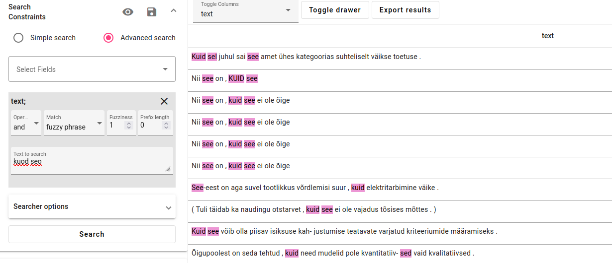 A phrase search for “kool elupiirkond”, with a slop of 3. This means up to three words can be between the two parts of the phrase.