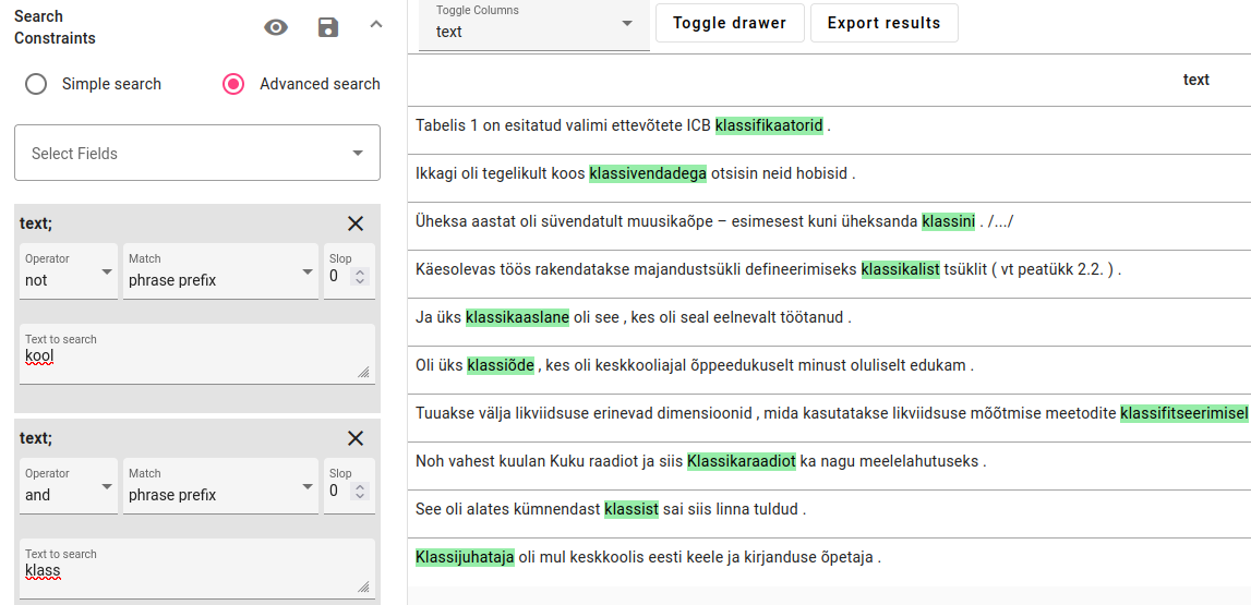 For example, if we search for klass, we will find words like klass, klassika, klassikaaslane, klassifikaator etc. It can be useful to find words that are conjugated or have declension. So for the Estonian example klass, we will also find klassis, klassi, klassile, klassiski etc.