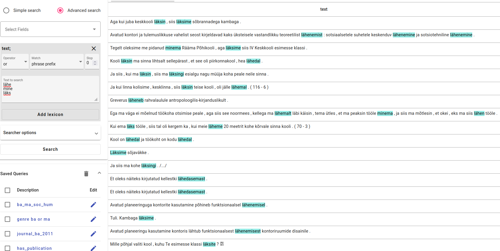 For words that have stem changes, it is also possible to search by entering the word stem and using the or operator, for example searching for different forms of minema (et to go) using forms like läheb, läks, mine.